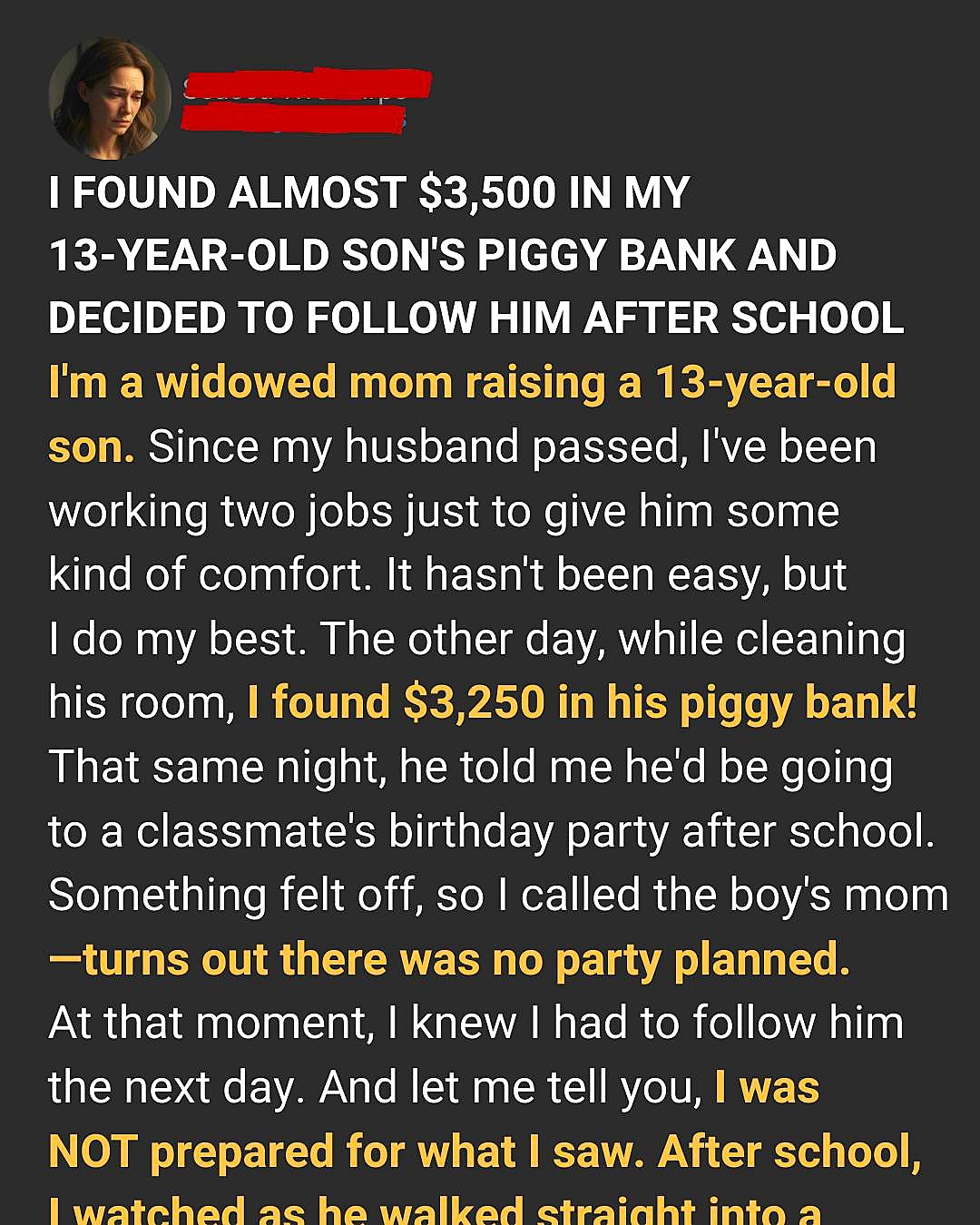 It was a shock I’ll never forget: finding $3,250 hidden inside my 13-year-old son’s piggy bank. My heart froze. Where could he possibly have gotten that kind of money? Determined to uncover the truth, I followed him after school—only to discover something that broke my heart in the most beautiful way.