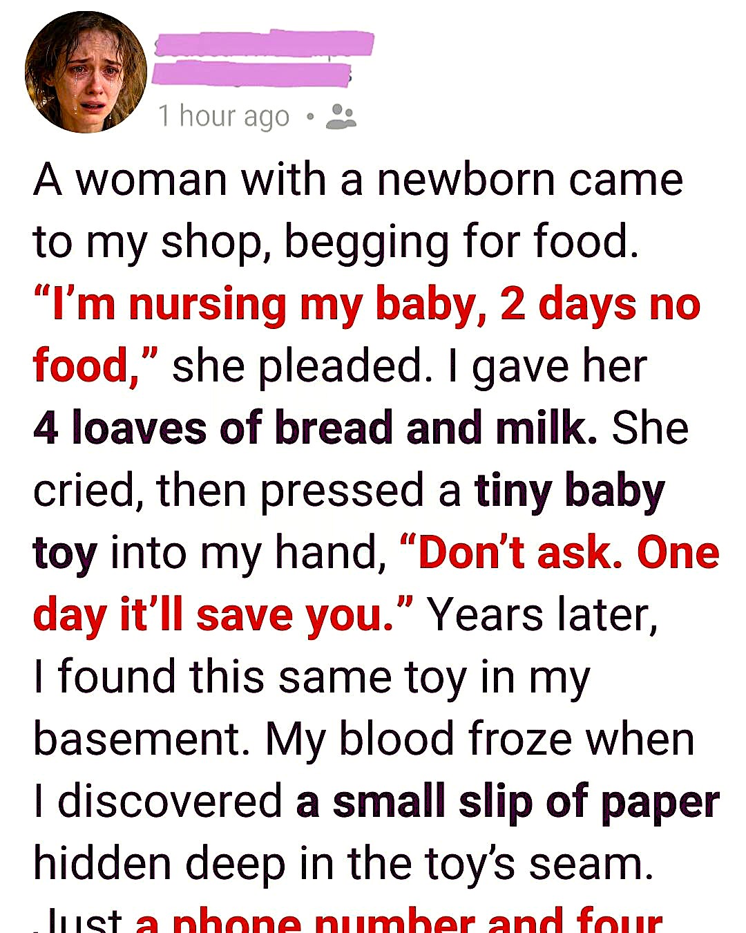Before she left, she did something unexpected. She reached into the blanket and pulled out a tiny baby toy, soft and worn, its stitching slightly frayed. She pressed it into my palm like it mattered more than the food I’d given her.