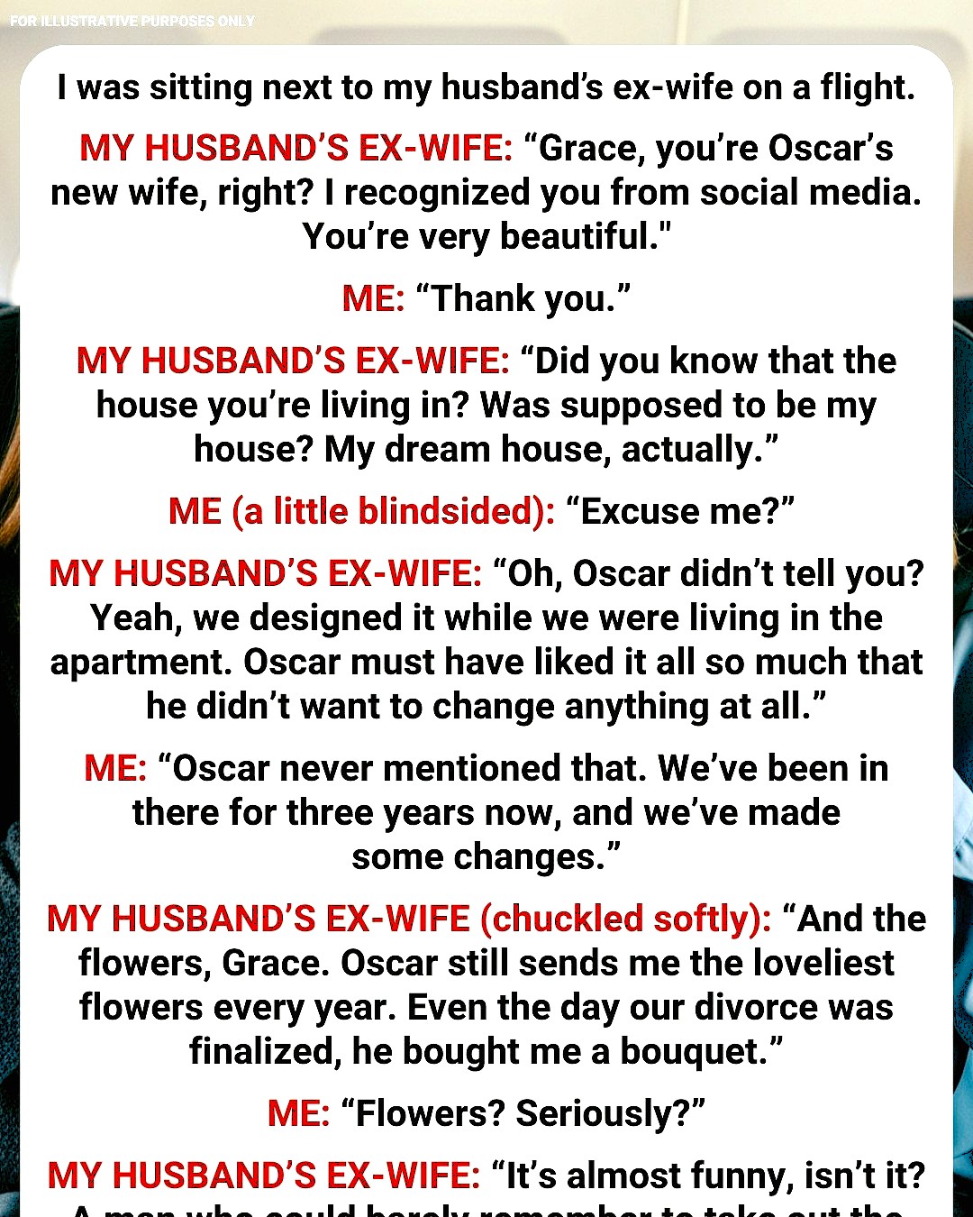 For the rest of the flight, I stared blankly at the seat in front of me, my mind replaying every moment of my marriage—now poisoned by her revelations.