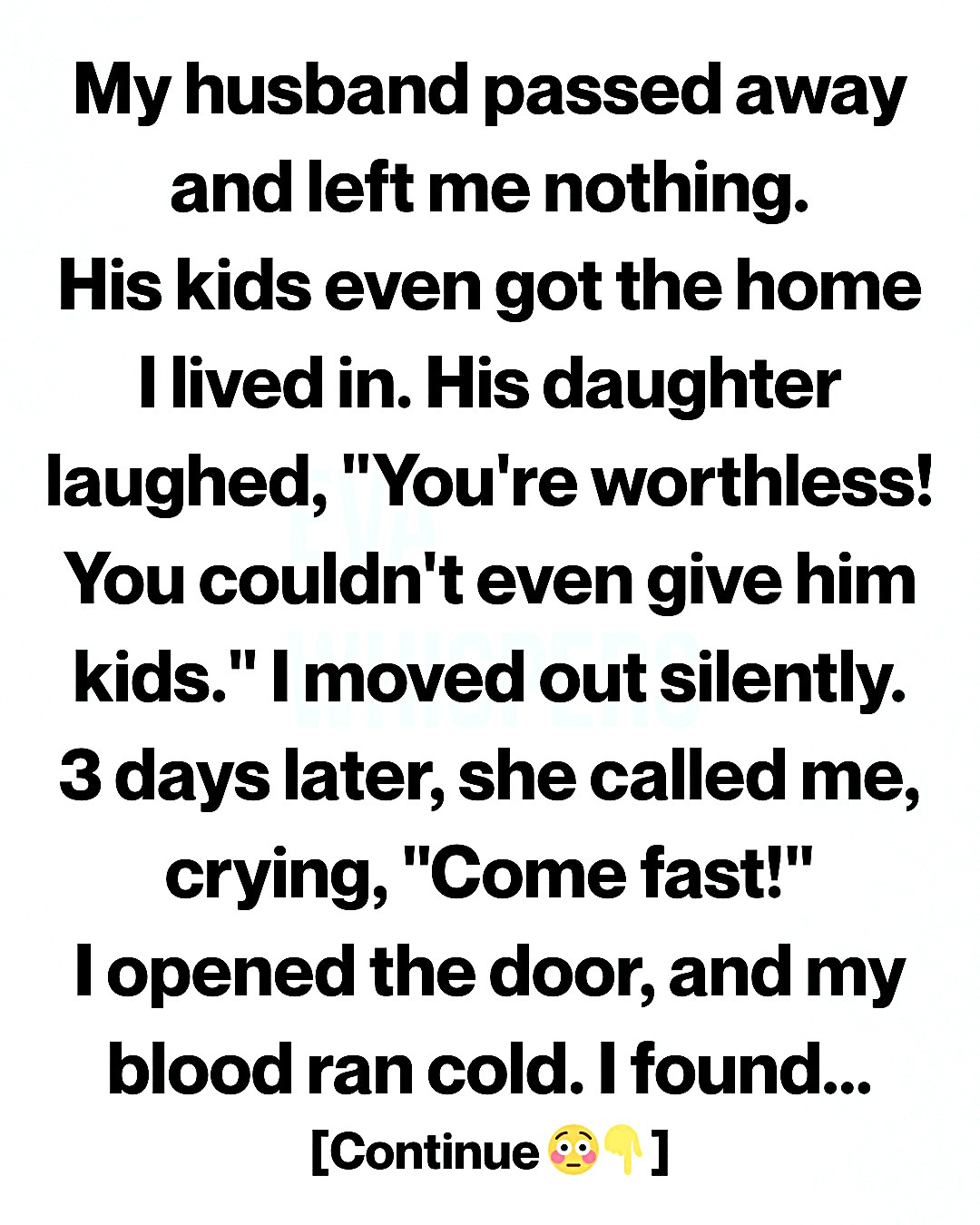 My husband died and left me nothing. Not a dollar, not a keepsake, not even the home I had lived in for twelve years. His children swooped in like vultures before the funeral flowers had wilted. His daughter, Melissa, walked through the house as if she already owned it. She turned to me with a smirk I will never forget and said, “You’re worthless. You couldn’t even give him kids.”