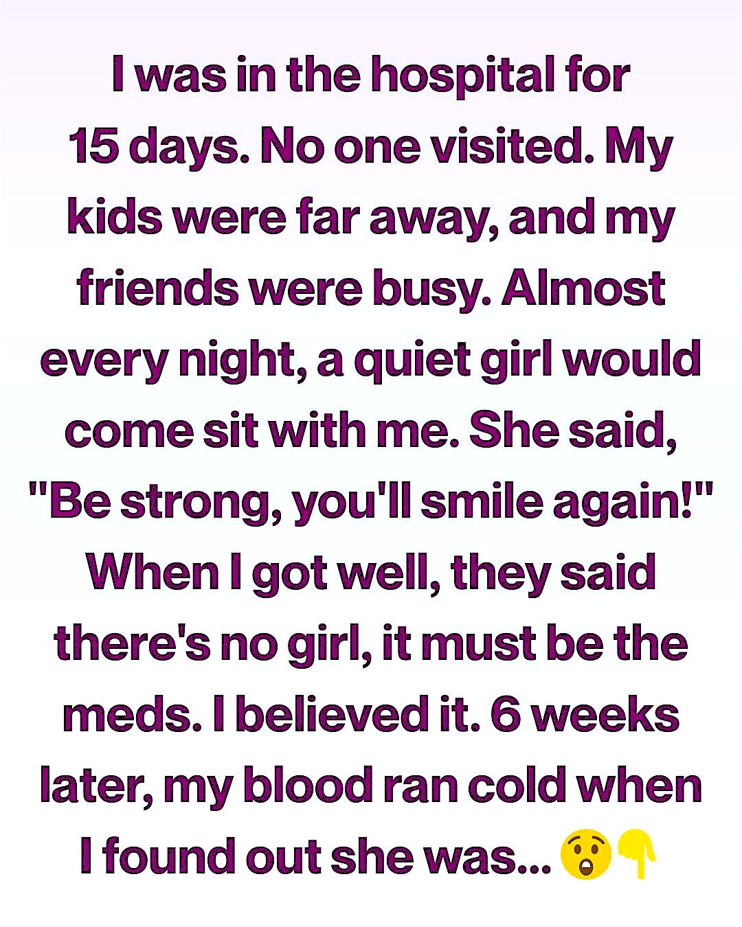 She was quiet, maybe thirteen or fourteen, with dark hair she tucked behind her ears and eyes that seemed older than her face. She never said much. She would pull a chair close to my bed and sit there, hands folded in her lap, as if she belonged. I couldn’t speak, couldn’t ask who she was or why she came, but somehow she understood. She’d lean in and whisper softly, careful not to disturb the room.