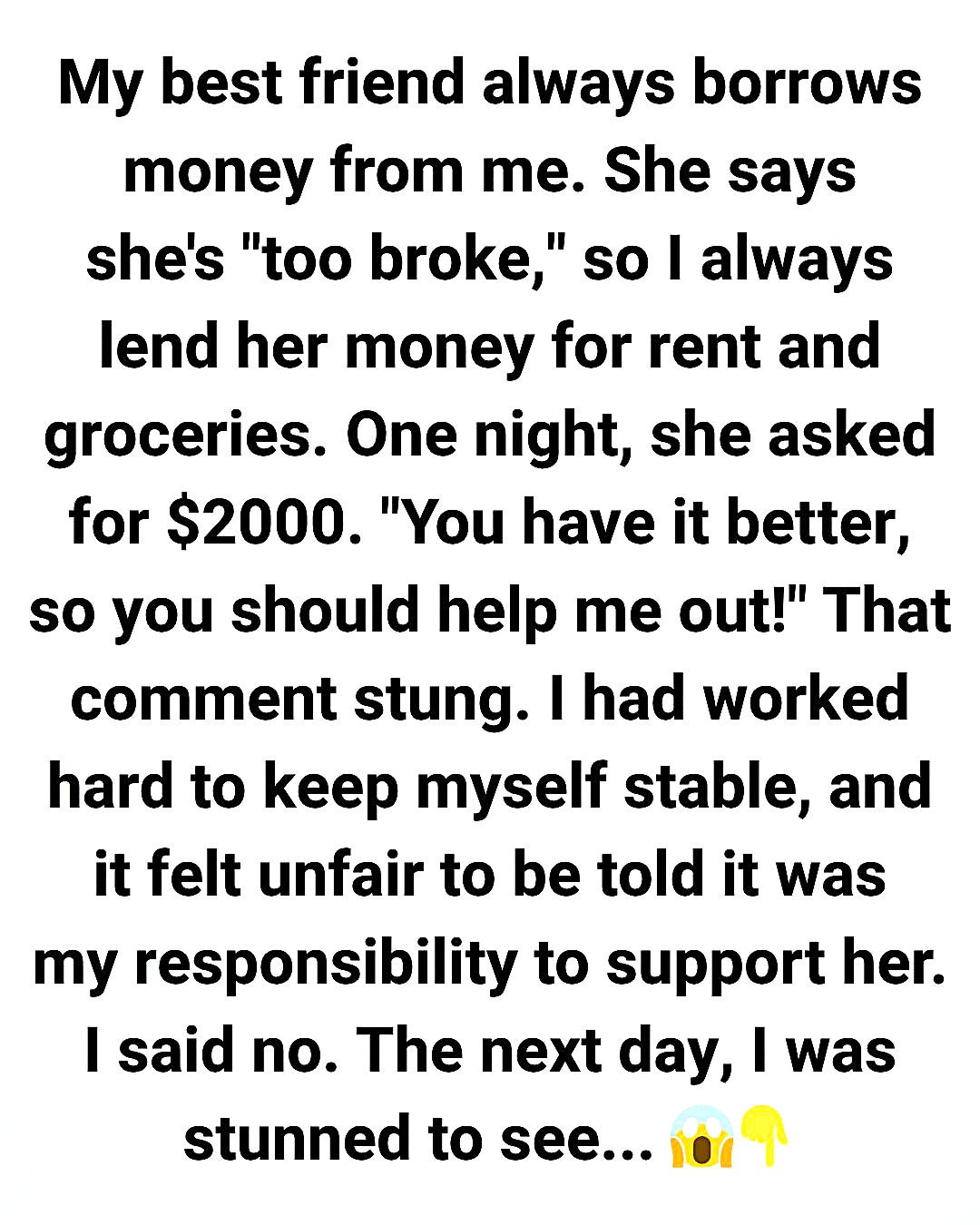 I never imagined that money could destroy a friendship, but lately, that’s exactly what seems to be happening. My best friend and I have been close for years, and I’ve always tried to be there for her. Whenever she said she was broke, I’d quietly step in—covering her rent, groceries, or small bills without asking questions. At first, it felt good to help someone I cared about, but over time, it stopped being an act of kindness and started becoming a pattern—an expectation.