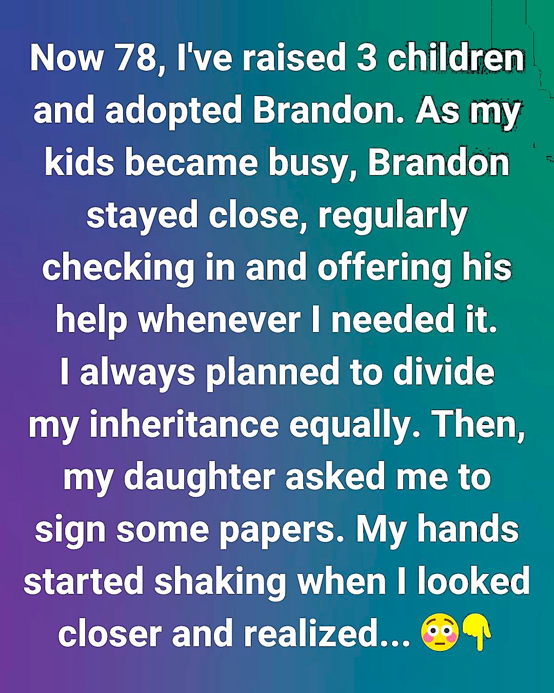 But everything changed recently. My eldest daughter handed me a set of forms—documents that would give my three biological children power of attorney over my affairs, completely leaving Brandon out.