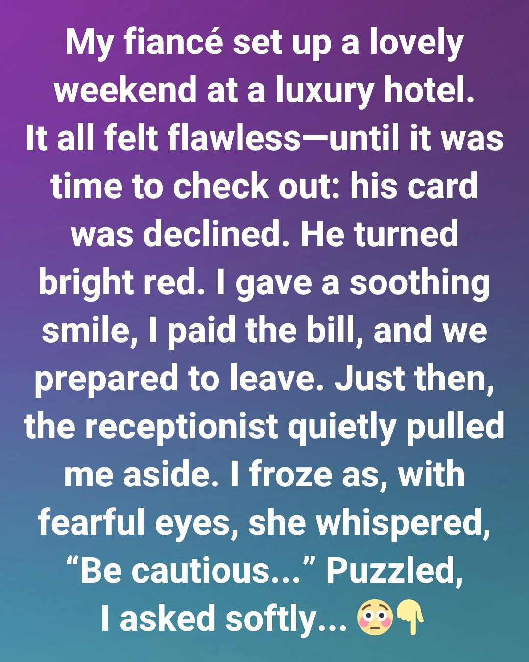 Confused, I followed her a few steps aside. She glanced nervously toward my fiancé, then back at me.