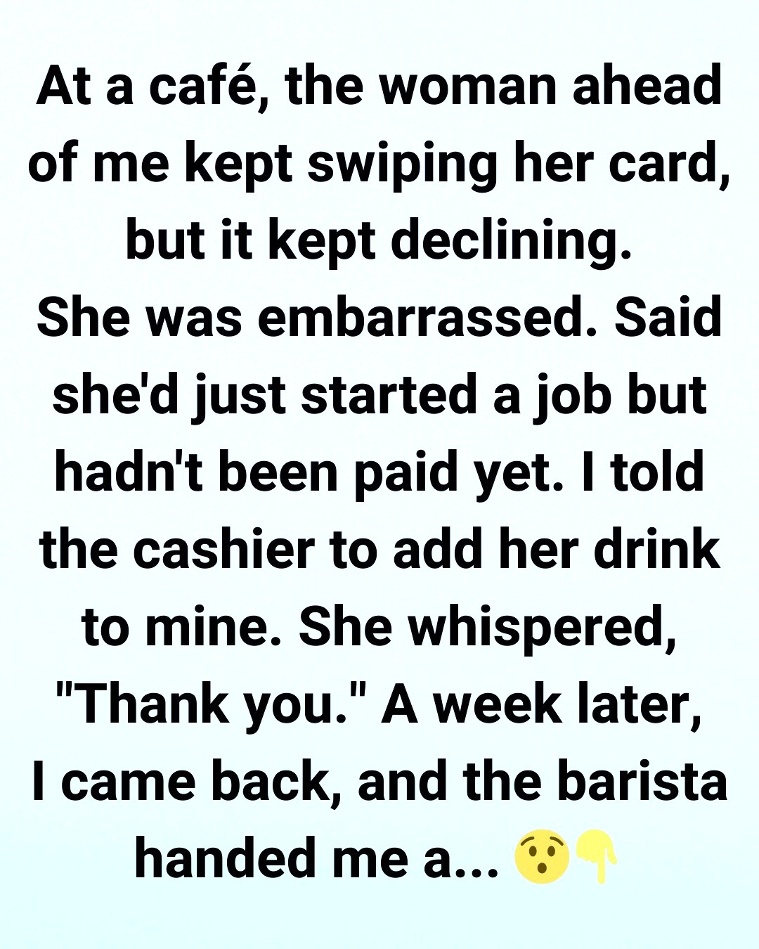 The woman froze for a moment, like she wasn’t sure she heard me right. When she turned around, her eyes were glossy, and she looked like she might burst into tears. She only managed a soft, shaky, “Thank you,” before stepping away with her drink. I gave her a small smile, told her it was no big deal, and assumed that was the end of the story. We were strangers, after all.