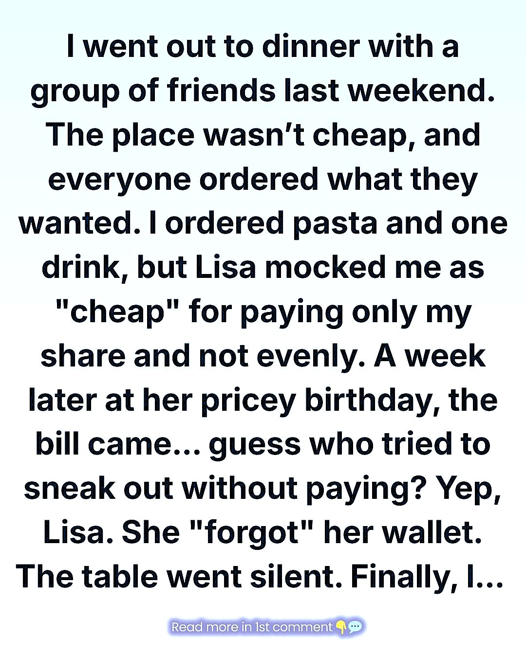At first, I forced a laugh, hoping she was joking. But then she leaned forward, her voice loud enough that people at nearby tables turned to look. “Seriously, if you can’t afford to eat out, maybe you shouldn’t come.”