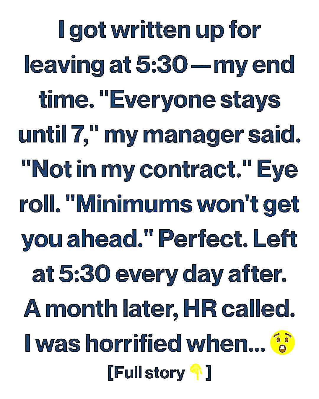 I left that meeting frustrated, but I made a decision: I would do exactly what my contract required—nothing more, nothing less. From that day on, I left at 5:30 every single afternoon.
