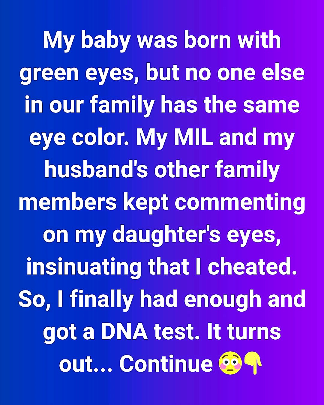 I, a 25-year-old female, gave birth to my daughter 2 months ago and despite my husband (28) telling me he knows I’d never cheat on him, I wanted to give our daughter a paternity test. The reason? She has green eyes and my husband and I both don’t have green eyes, my parents don’t either, and neither do my in-laws — no one in my family has them. My husband said it was probably some weird genetic thing, but I wanted the test for his peace of mind.