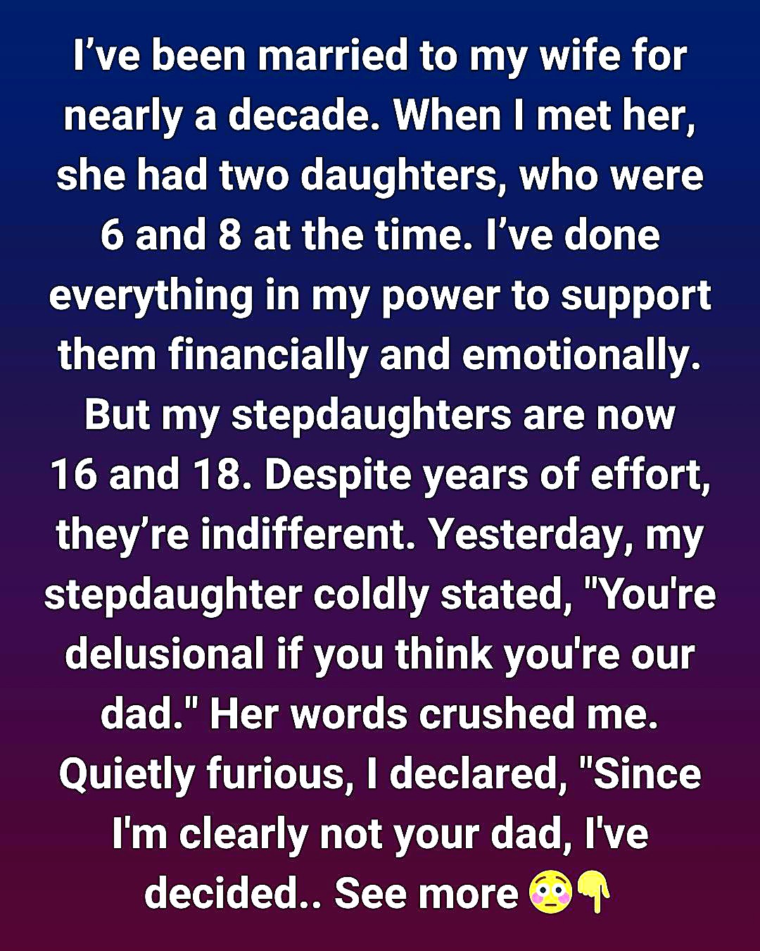 But my stepdaughters are now 16 and 18. Despite years of effort, they’re indifferent. No matter how much love and dedication I showed, there was always a barrier. Julia always assured me they’d come around eventually, but after ten years, I felt like nothing had changed.