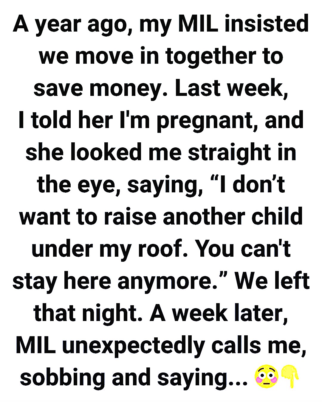 Fast-forward to last week, I find out I’m pregnant. I was nervous but also really excited. We sit down with MIL to share the news, expecting at least some kind of happy reaction. Instead, she crosses her arms, looks me dead in the eye, and said something like this, “I don’t want to raise another child under my roof. You can’t stay here anymore.”