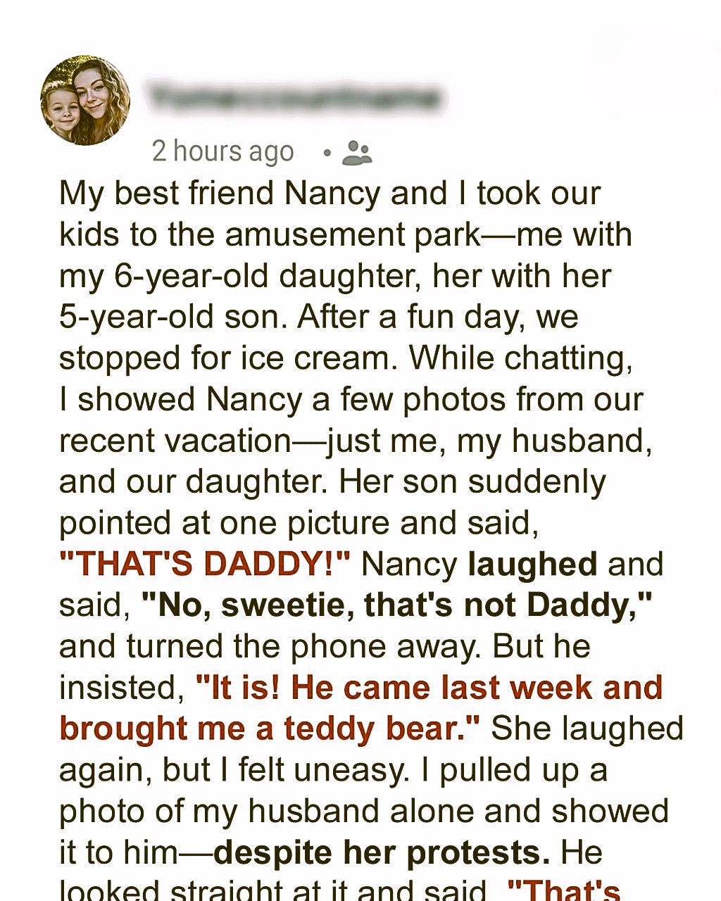 I let out a sound that was half sob, half primal scream. The truth was not just a twist, it was an axe through the core of my existence. It shattered everything I thought I knew, everything I loved, everything I was. And the worst part? I still had to walk into that house tonight, to face the man who stole my life, and the woman who helped him do it. The woman I called my best friend. The woman who was raising my son.It was just another Tuesday. A quiet café, the scent of espresso mingling with something sweet from the bakery case. My best friend, Sarah, and I were catching up, our usual ritual. Across from us, her five-year-old son, Leo, was engrossed in a drawing app on her tablet. He’s a sweet kid, bright and full of energy. I adore him. I always have. He feels like my own in so many ways, the son I never had.