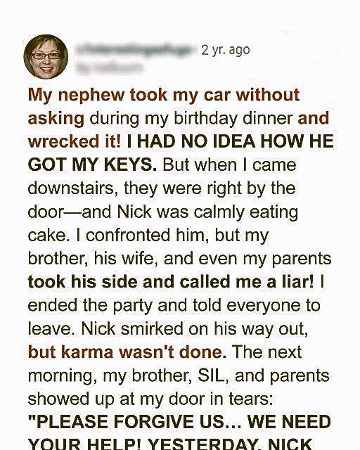The air left my lungs. My blood ran cold, then hot, then everything went numb. MY SON? The boy I’d resented, the boy whose recklessness had destroyed my car, the boy I’d seen as my nephew, my brother’s responsibility… he was mine? The boy I had wished karma on. The boy I had, for years, silently resented for stealing my car, for causing me so much pain. My own flesh and blood.