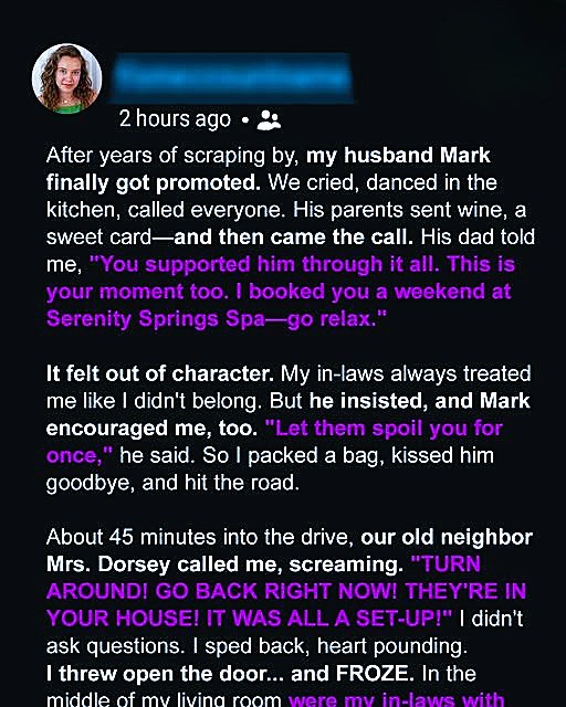 When my father-in-law offered to send me on a luxury spa weekend, I thought maybe my in-laws were finally trying to include me. I was halfway to the resort, driving in peace, when my elderly neighbor called, screaming for me to turn back. What I saw when I got home shook me to my core.