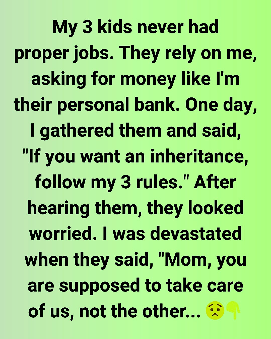 One day, I gathered them and said, “If you want an inheritance, follow my 3 rules.” After hearing them, they looked worried. Then they laughed at my face.