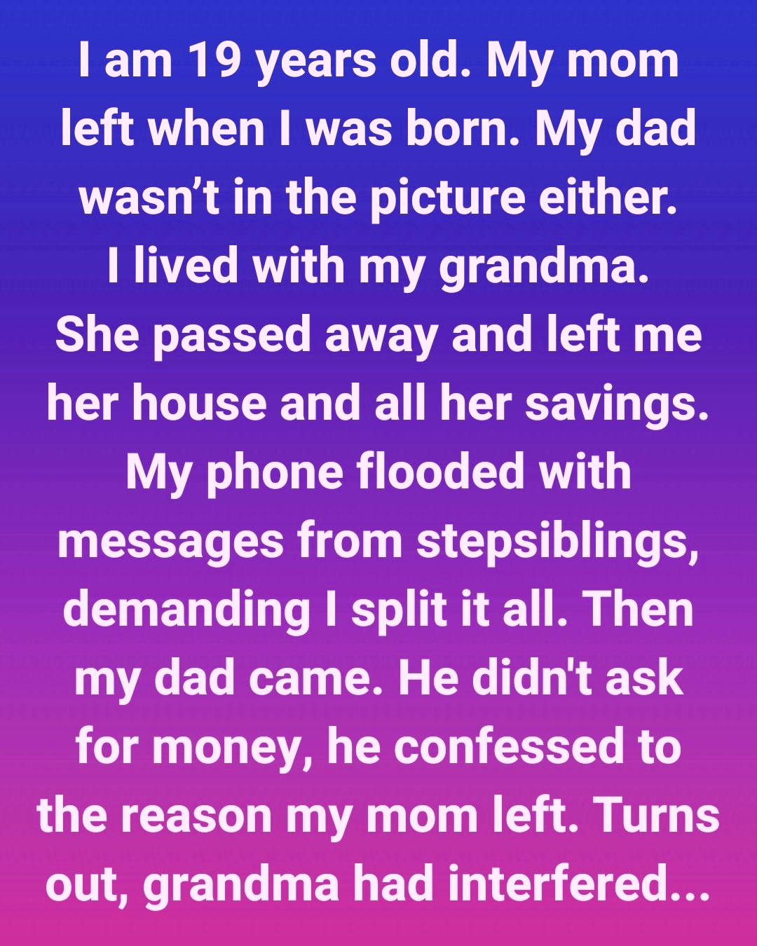 Grandma was always the only family I had. When she died, she left me her house and all her savings. Soon, my phone flooded with angry messages from my stepsiblings, demanding I split it all. I wasn’t going to listen to them until my dad came, and instead of asking for money, he confessed the real reason my mom left. It wasn’t because she didn’t want me.