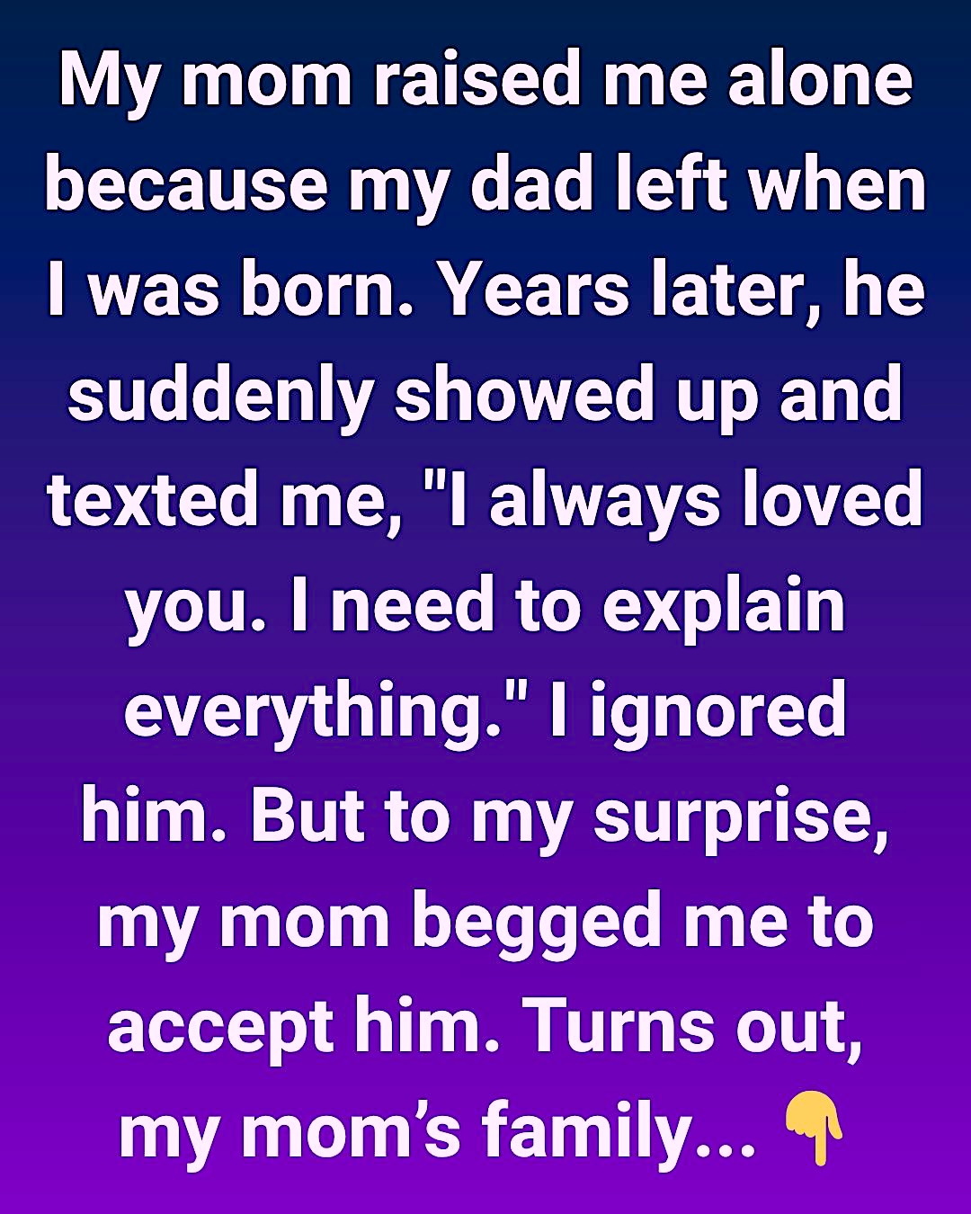 I didn’t reply. I ignored the message. But to my surprise, my mom actually begged me to talk to him. She said softly, “It wasn’t his fault because it was my family who pushed him out of our lives. I was young and scared, and I let them.”