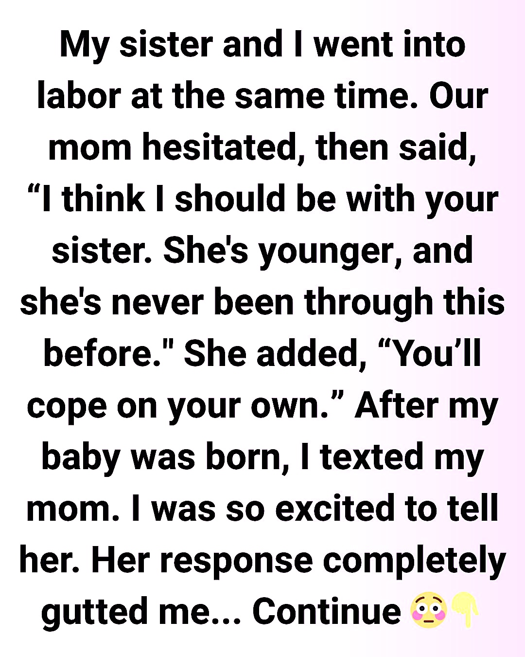 That was the first time I felt like I was second on the list. I told her I understood, and she hung up. I gave birth to a beautiful baby girl. As soon as she was cleaned up and in my arms, I texted my mom to let her know. I was so excited to tell her.