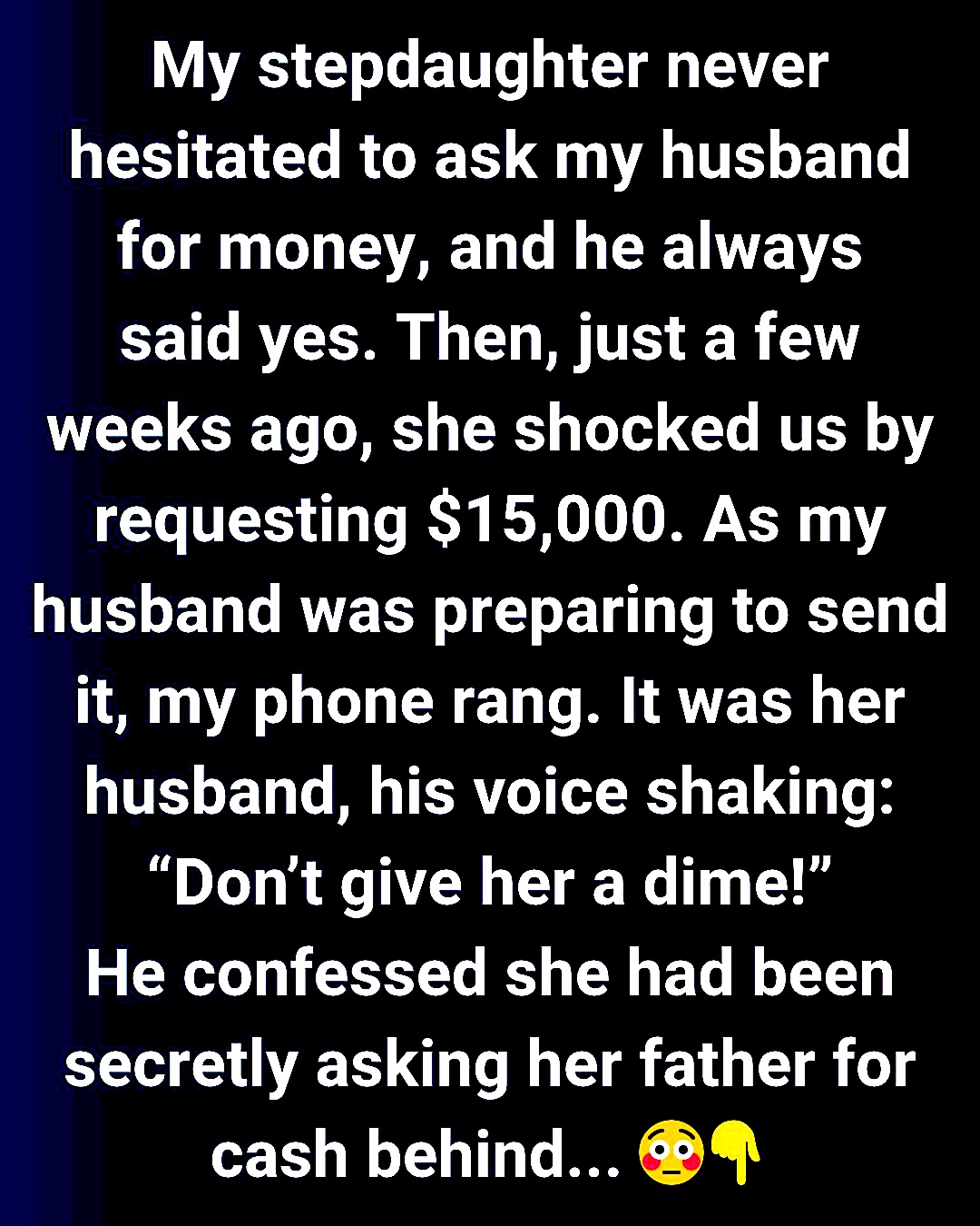My stepdaughter has always asked my husband for money. Sometimes small amounts, sometimes bigger ones, but the pattern is the same. She asks, he pays, no questions asked. I always thought it was odd, especially since her husband, Nolan, has a very solid job and makes good money. I never understood why she needed to keep turning to her dad.