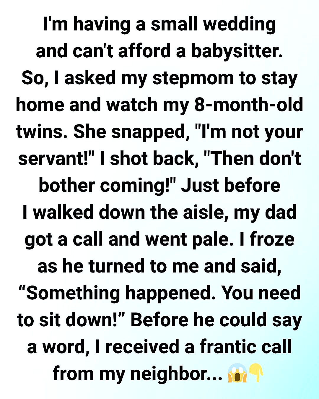 I was planning a small, intimate wedding and, with every penny accounted for, I couldn’t afford a babysitter. So, I asked my stepmom if she could stay home and watch my 8-month-old twins during the ceremony.