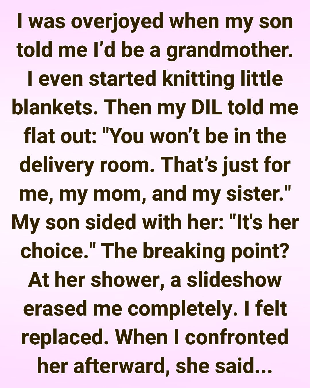 And the cruelest part? Her mother called me privately to say that my daughter-in-law told her she doesn’t want me babysitting once the baby is born.