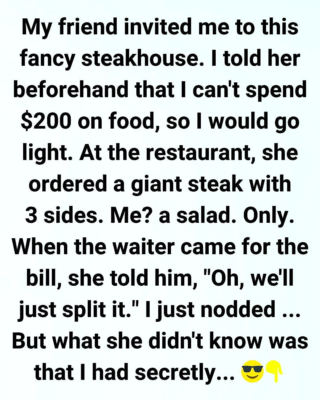 Sitting there, with her empty steak plate and my finished salad, we both realized something valuable: true friendship grows through honest communication and mutual respect.