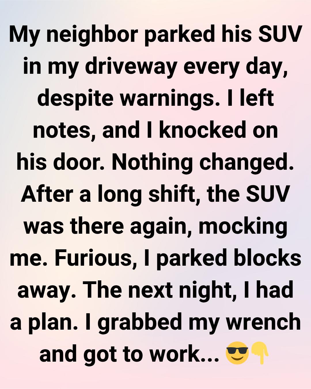But the next day, there it was again—his massive SUV, right in my driveway, like a silent middle finger. No note in return. No apology. Just that same car, sitting there as if daring me to complain.