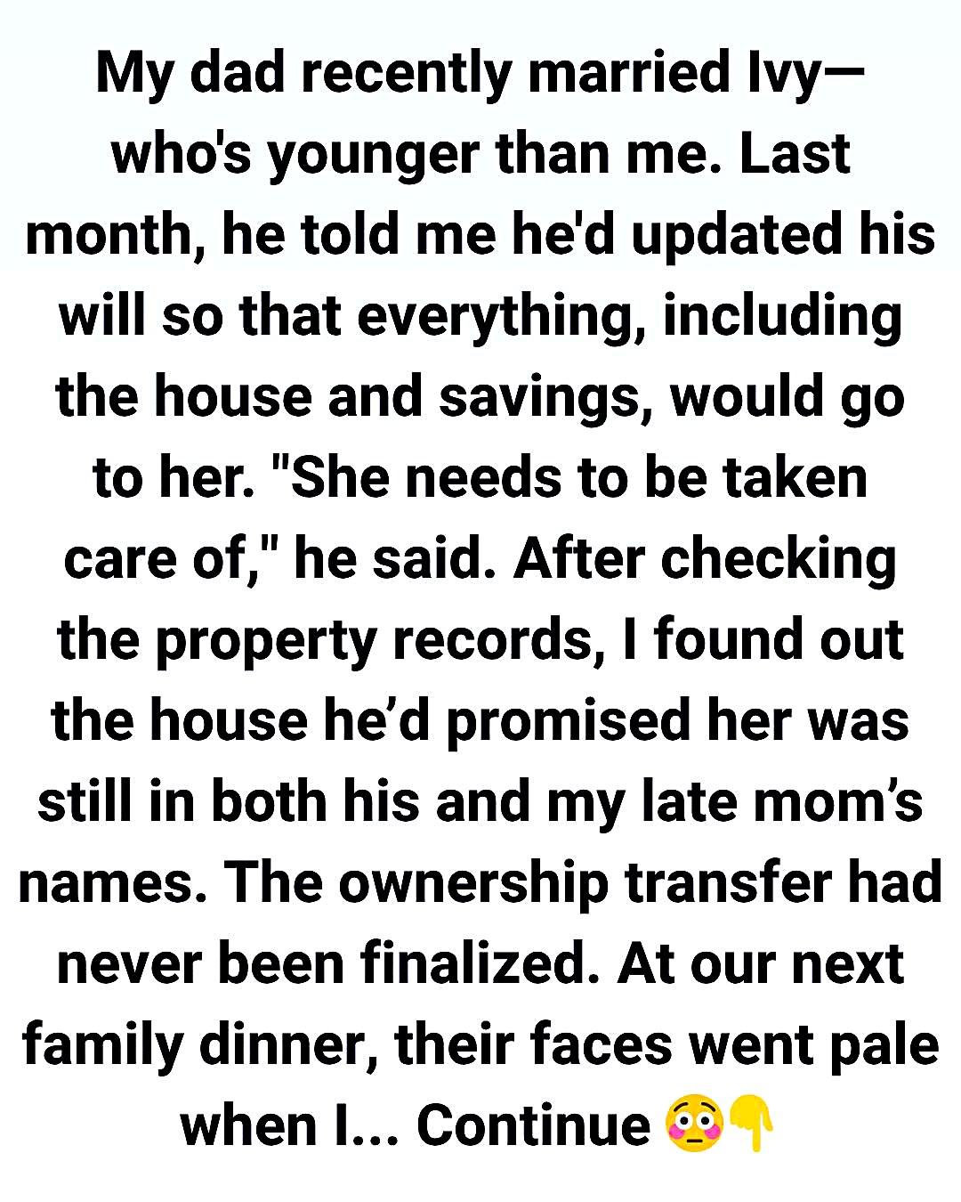 So I did some digging. After checking the property records, I discovered something he clearly hadn’t told her: the house he’d promised Ivy was still in both his and my late mom’s names. The ownership transfer had never been finalized — which meant half of it legally belonged to me.