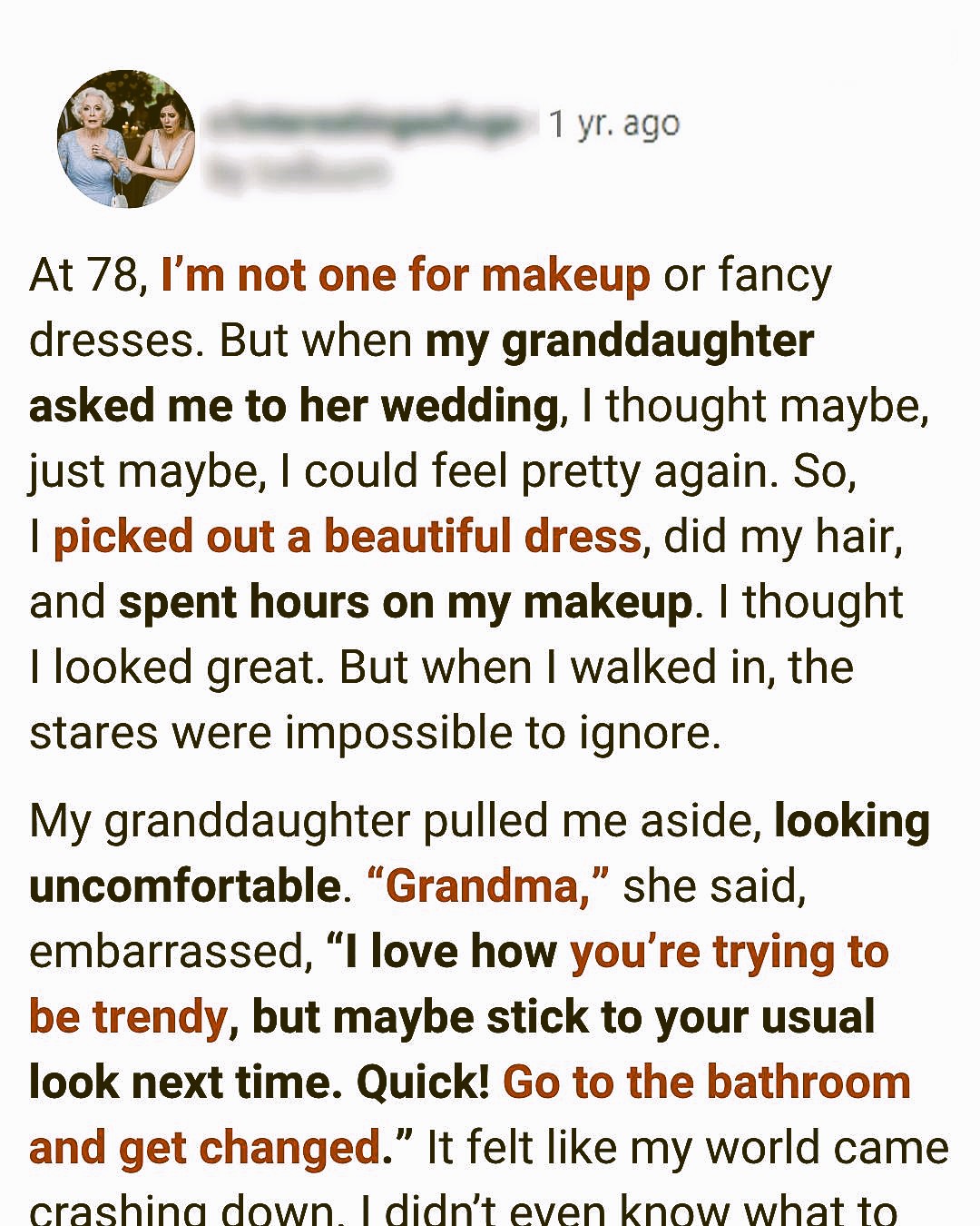 But the second I walked through the door, I noticed the looks. Side glances, whispers, even raised eyebrows. My stomach dropped. Then my granddaughter came rushing over. She pulled me aside, clearly embarrassed. She said: “Grandma, I love how you’re trying to be trendy, but maybe stick to your usual look next time. Quick! Go to the bathroom and get changed.”