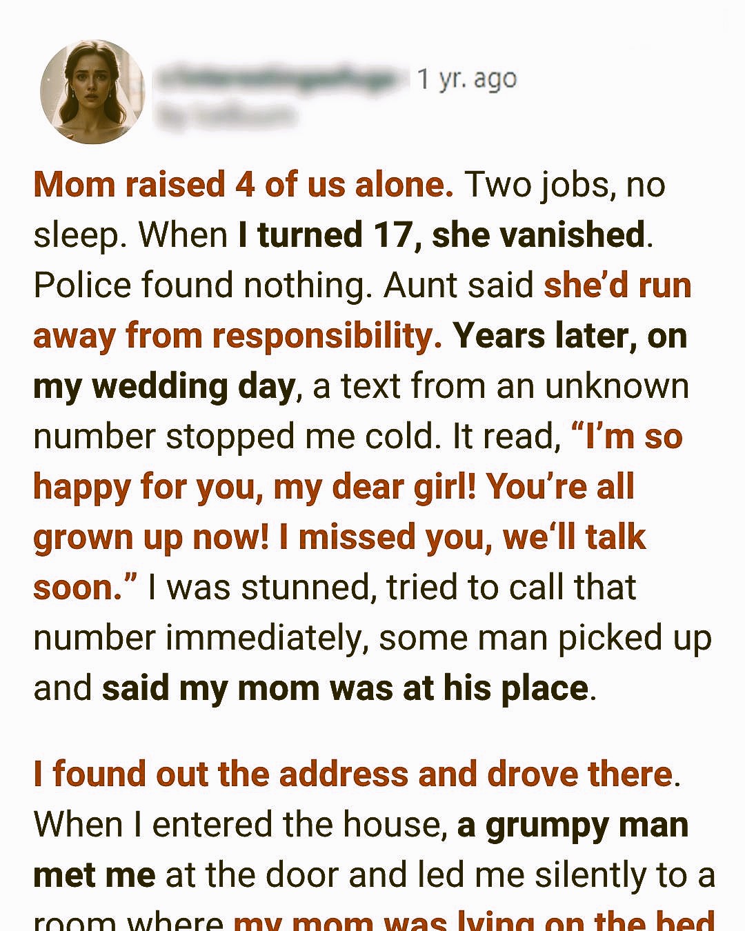 Mom raised the four of us completely on her own. She worked two jobs, barely slept, and carried the weight of the world on her shoulders. I always admired her strength, but when I turned 17, everything changed. One day, she was just gone. Vanished without a word.