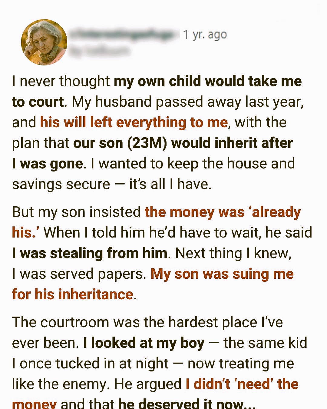 I never thought my own child would take me to court. After my husband passed away last year, his will clearly stated that everything — the house, the savings, the investments — would go to me, and that our son, Jake, would inherit after my passing. It was meant to give me security in my old age, something my husband had always worried about. I never imagined that same act of love would tear our family apart.
