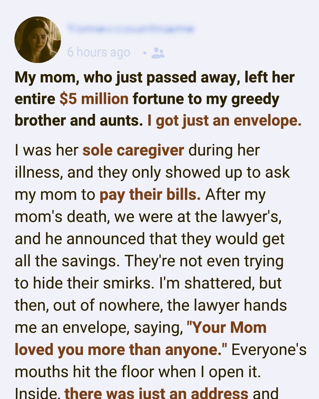 My mom, who just passed away, left her entire $5 million fortune to my greedy brother and aunts. I got just an envelope. I had been her caregiver through every sleepless night and doctor’s visit, while they only came around when they needed money.