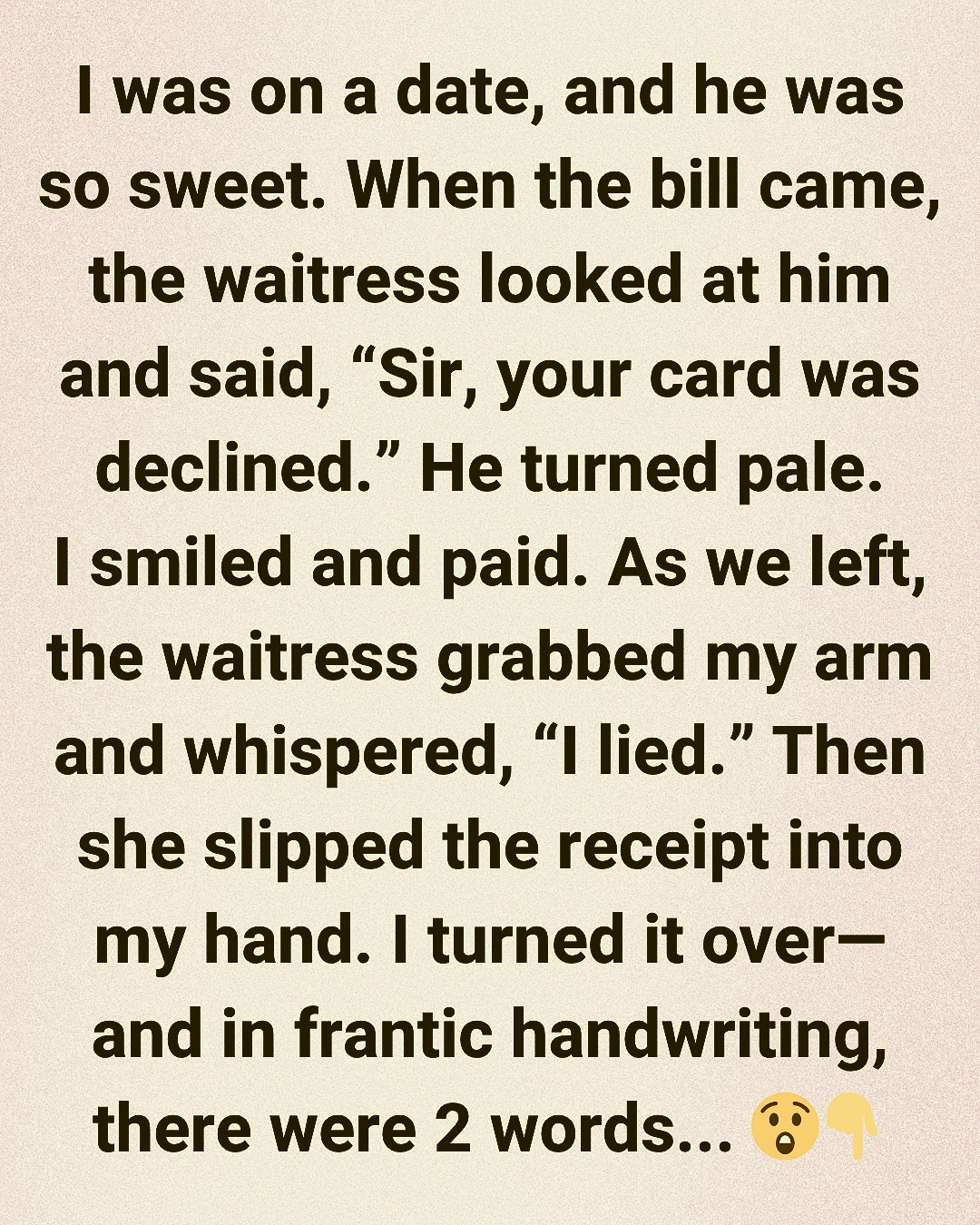 I couldn’t be more grateful to that waitress. Her courage, kindness, and quick thinking saved me from something terrible. I realized she had staged the declined card incident just to have an excuse to slip me that message.