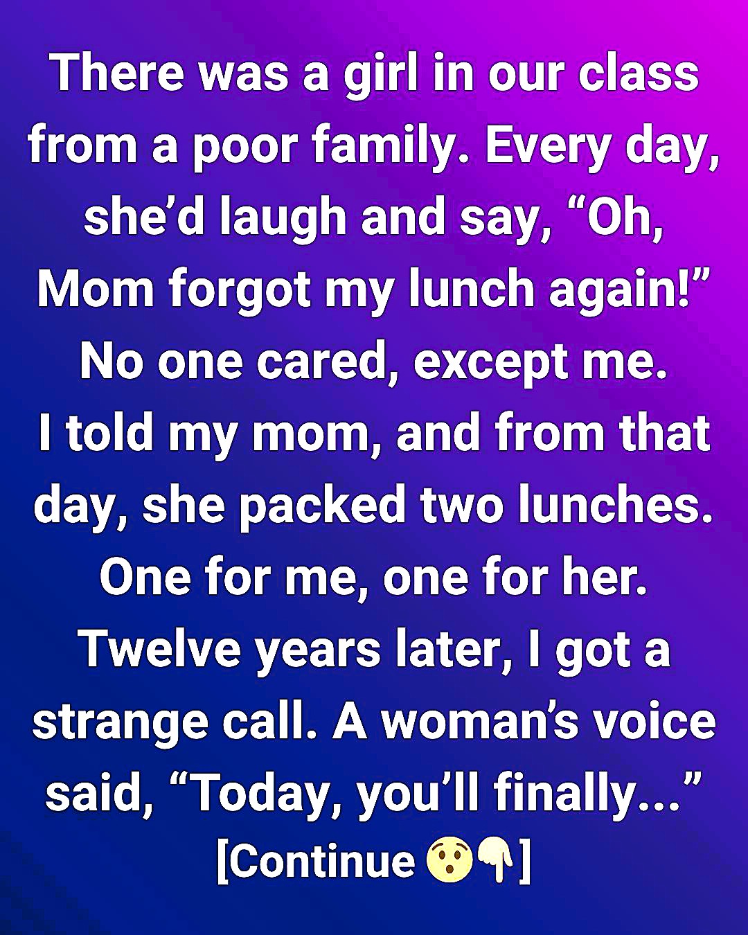 There was a girl in our class from a poor family. Every day, she’d laugh and say, “Oh, Mom forgot my lunch again!” No one cared, except me. I told my mom, and from that day, she packed two lunches. One for me, one for her.