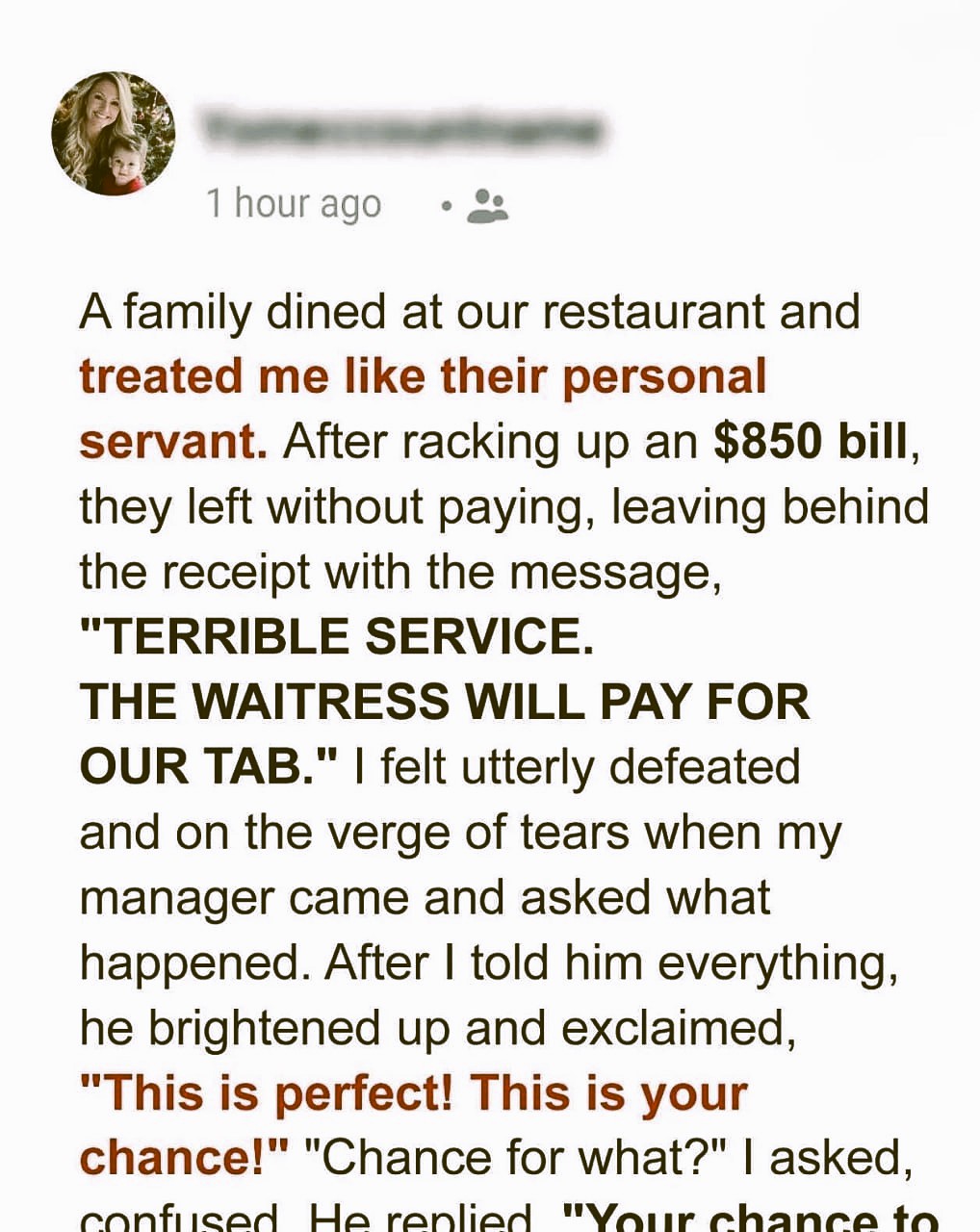 I felt a cold dread spread through me. The manager, a man who saw dollar signs where I saw my future, came over. His face was thunder. He picked up the check presenter. Empty. He stared at me, then at the table. “They just… walked out?” he asked, his voice dangerously low. I could only nod, numb. $850. The bill. An astronomical amount for a single table. My entire shift’s potential earnings, gone. More than that, a massive hole in the restaurant’s profit, which meant a massive hole in my future. He made it clear: if I didn’t find a way to cover it, it would come out of my future paychecks. PANIC. Pure, unadulterated terror. How could I pay that? I can barely pay my rent! This wasn’t my fault! I did everything right! My mind raced, utterly frantic. I felt violated, robbed, and utterly, totally helpless.