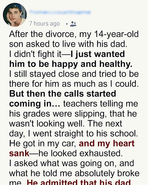 I tried to arrange a visit. His dad was evasive. “He has a lot of homework,” or “He’s got a big project this weekend.” Excuses piled up like bricks, building a wall between me and my boy. The knot in my stomach tightened into a vice. I KNEW. I KNEW I HAD TO GET HIM OUT.