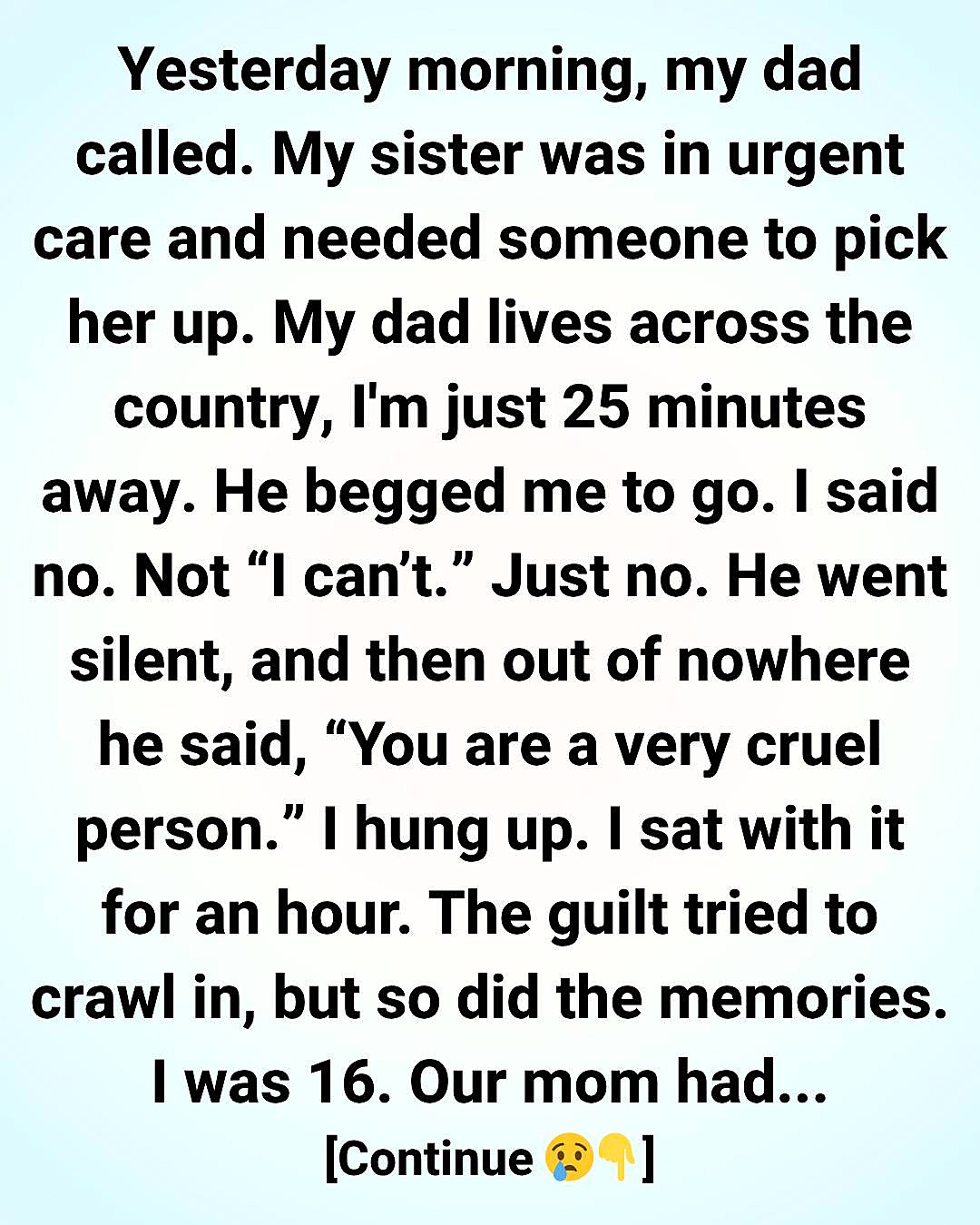 Yesterday morning, I got a call from my dad. My sister (28F) had been rushed to urgent care after collapsing at home. She has a chronic illness that’s been getting worse, and apparently, there was no one around to help her. My dad lives across the country, and I (26F) live just twenty-five minutes away.