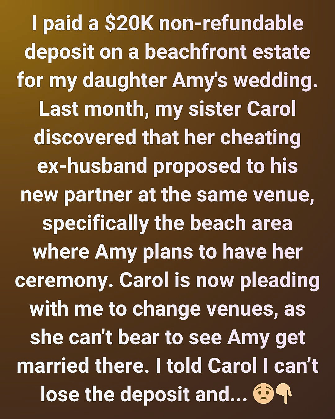 “I (51F) put down a $20K non-refundable deposit on this gorgeous beachfront estate for my daughter, let’s call her Amy’s (26F), wedding next September. We booked it 18 months out. For context, and without revealing too much, it’s THE venue in our area, and it has been Amy’s dream wedding spot in all of her Pinterest boards.”