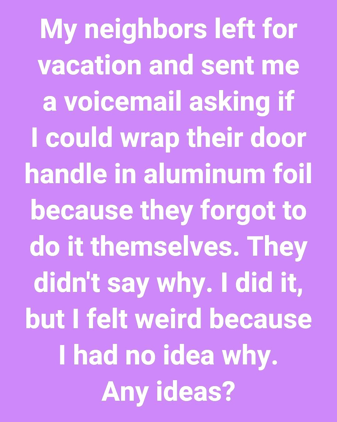 hen my neighbors went on vacation, they left me a voicemail asking if I could cover their door handle with aluminum foil. They didn’t explain why, and they sounded hurried, so I agreed without thinking much about it.