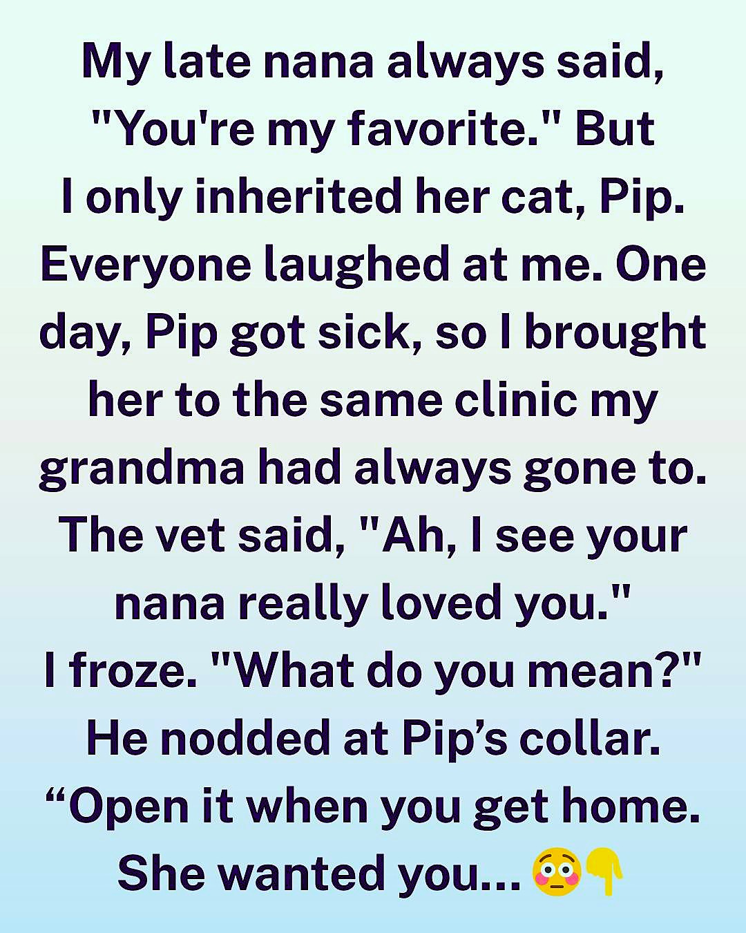 My late nana always said, “You’re my favorite.” She’d whisper it with a wink whenever she handed me an extra cookie or asked me to stay a little longer after dinner. But when she passed, those words felt like nothing more than a sweet memory. At the will reading, my cousins walked out with jewelry, money, and pieces of antique furniture. All I received was her old cat, Pip.