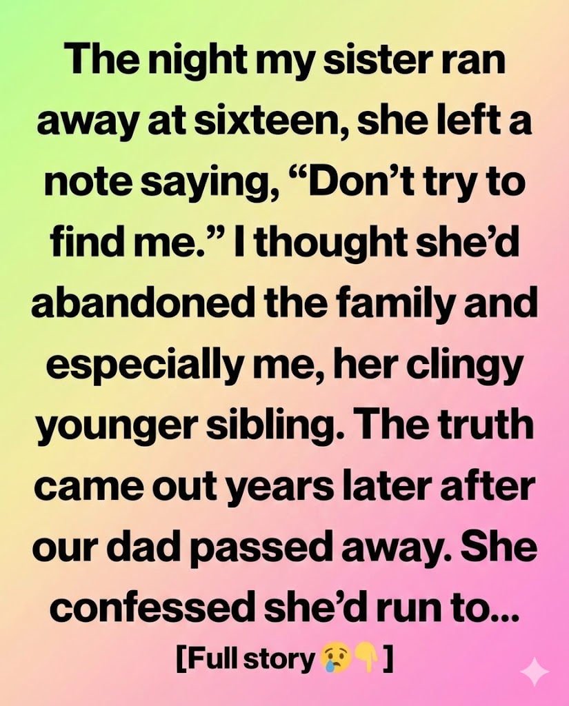 We didn’t see her again for a long time. Postcards came sometimes. A phone call once a year if we were lucky. Mom defended her weakly. Dad never spoke her name. And I grew up with a hole where my sister should have been, telling myself I didn’t need her.