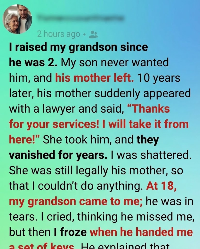 I raised my grandson from the time he was two years old. My son never wanted him, and his mother disappeared without a trace. I became his whole world, and he became mine. I cooked his meals, held him through nightmares, and watched his tiny hands grow steady and strong. I thought our little life together would go on forever.
