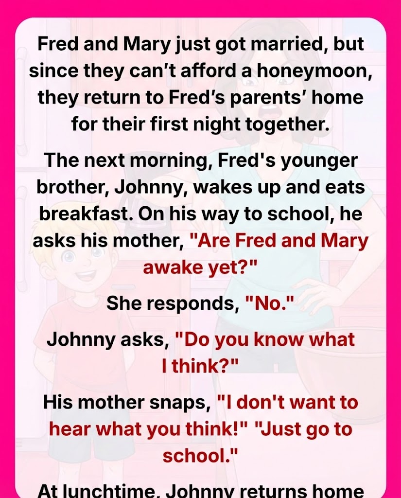 The next morning, Fred’s younger brother, Johnny, wakes up and eats breakfast. On his way to school, he asks his mother, “Are Fred and Mary awake yet?”