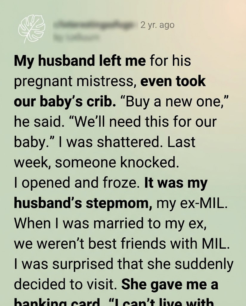 “Take this,” she continued. “There’s enough on it to buy what you need. Food. Rent. Baby things if you decide you’re ready again someday. Enough to give you time to find work and stand on your feet.”