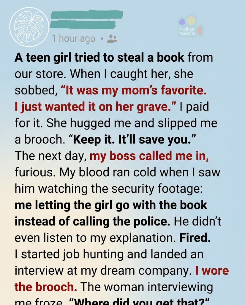 “I wasn’t trying to steal for fun,” she cried. “It was my mom’s favorite book. She used to read it to me before she got sick. She died last year. I just… I wanted to put it on her grave. I wanted her to have it.”