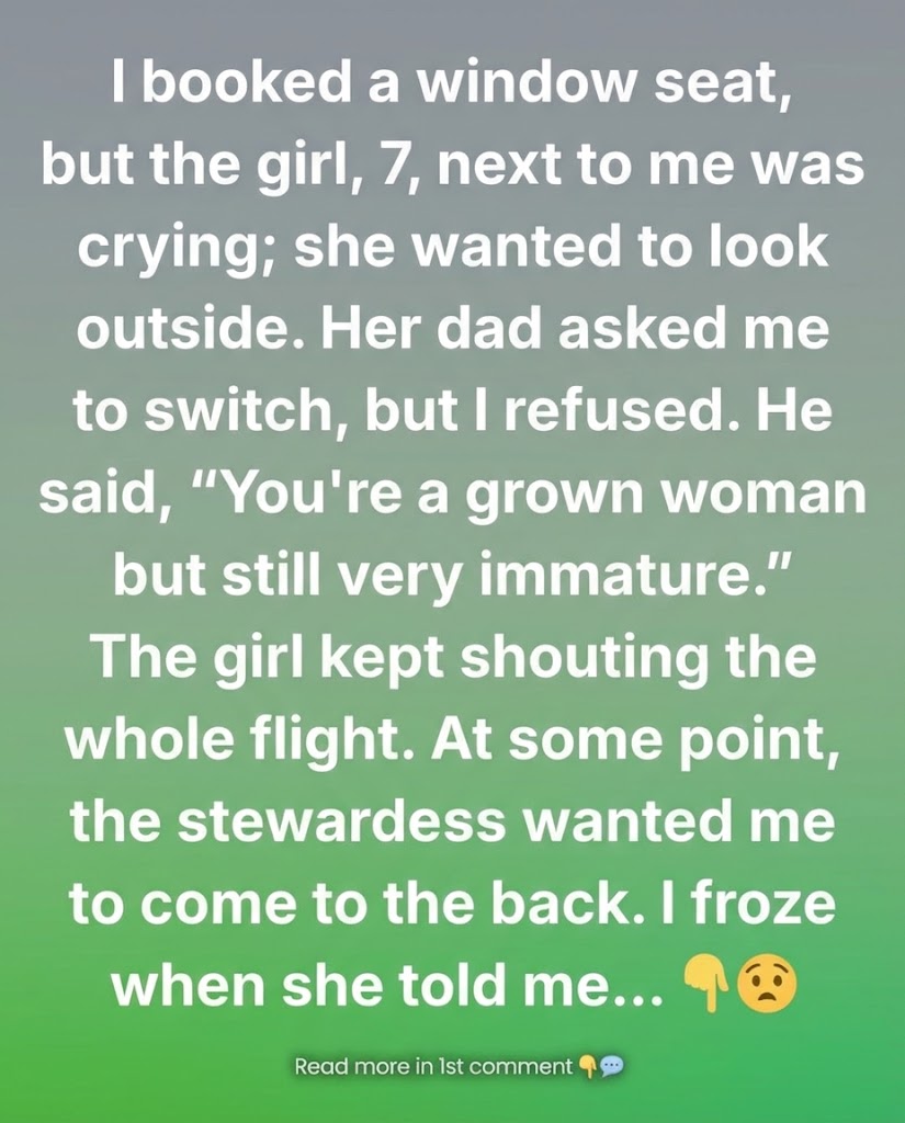 I had specifically booked a window seat for my flight. I’m the kind of traveler who likes watching the world shrink beneath the clouds, so I always make sure to reserve that spot. But as soon as I sat down, the little 7-year-old girl next to me burst into tears. She kept insisting she had to look outside, and her father immediately leaned over and asked if I could switch seats with her.
