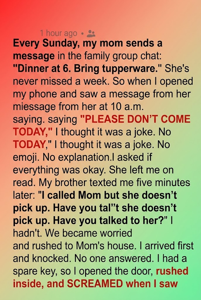 I arrived first. Mom lives only ten minutes away from me, but that drive felt like an hour. When I pulled up, the curtains were closed. That was the first red flag—Mom always opens her windows first thing in the morning to “let the sun bless the house,” as she says.