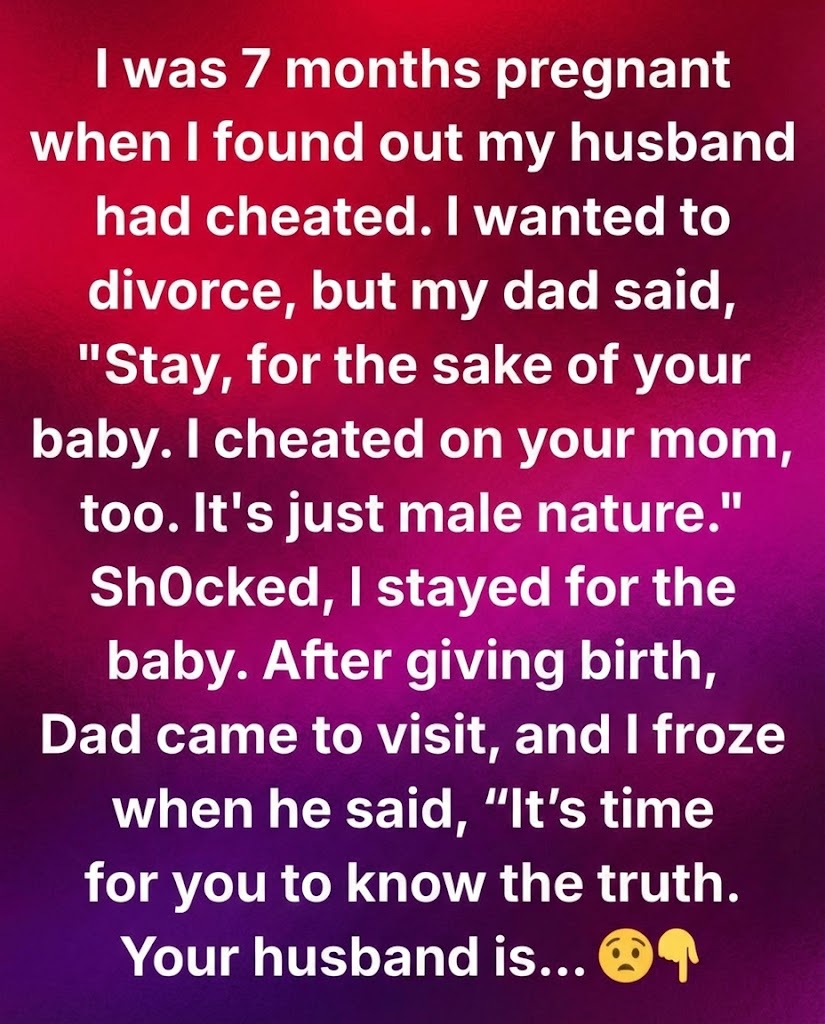He spoke gently, as if choosing every word with care. “You should stay with your husband for the sake of your baby,” he said. “I also cheated on your mom when she was pregnant. It’s just male physiology, it doesn’t mean anything.”