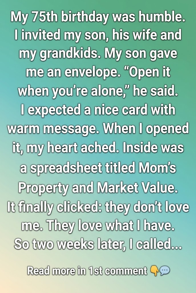 Later that night, I opened it. It wasn’t a card at all. It was a spreadsheet titled “Mom’s Property and Market Value.” Every possession I own—my house, jewelry, even my small stock portfolio—had notes about who should get what. Everything neatly itemized like I was a storage unit they were planning to empty.