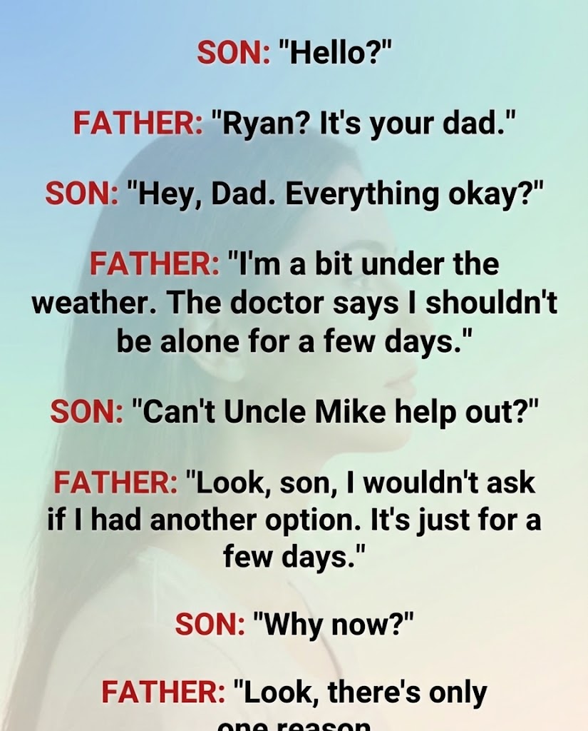 “Not really,” his father, Larry, answered, and something in his tone made Ryan straighten. “I’m a bit under the weather. Nothing serious,” he rushed to add, “but the doctor says I shouldn’t be alone for a few days.”