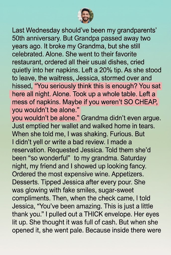 The ‘response coming’ to the waitress? It wasn’t about my twenty-dollar bill. It wasn’t about some clever retort. The response coming was the EARTH-SHATTERING REALIZATION THAT I HAD FAILED MY GRANDMA. That while I was feeling righteous anger over a perceived slight, she was quietly, dignifiedly, battling a war I knew nothing about. The heartbreak wasn’t for her perceived insult; it was for the silent, unbearable burden she’d carried, all while smiling and making me believe everything was fine. And that small, pathetic tip? It wasn’t just money. It was a cry. A cry I had been too self-absorbed to hear. And now, I had to face the brutal truth: I hadn’t saved her from the waitress’s mockery. I had failed to save her from the abyss.
